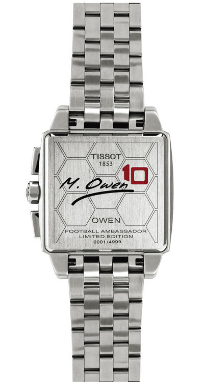 天梭 (TISSOT) 迈克·欧文限量版腕表在表盘的10点位置处印有特别的数字“10”,代表欧文在英格兰国家队的球衣号码;表后盖上则刻有欧文的签名以及独立的限量编号,该款腕表全球仅发行4,999枚。