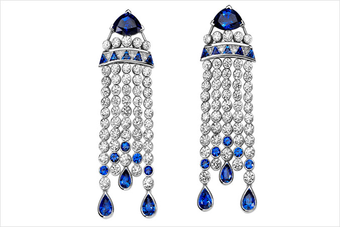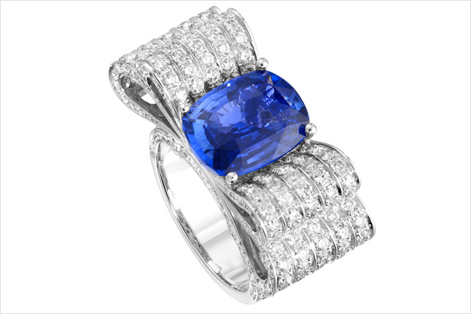 在主要的蓝色背景墙上,涂绘的素描引人联想着时尚伸展秀的出场排程;展示柜里,宝石在线绸、丝缎、精细的蕾丝及缝纫针线中闪耀着。