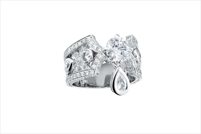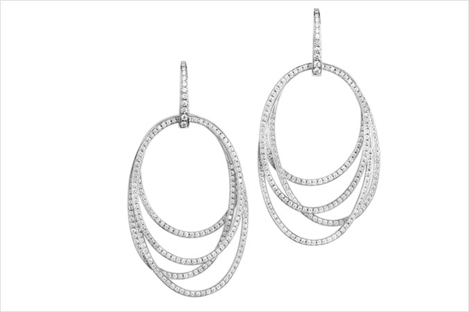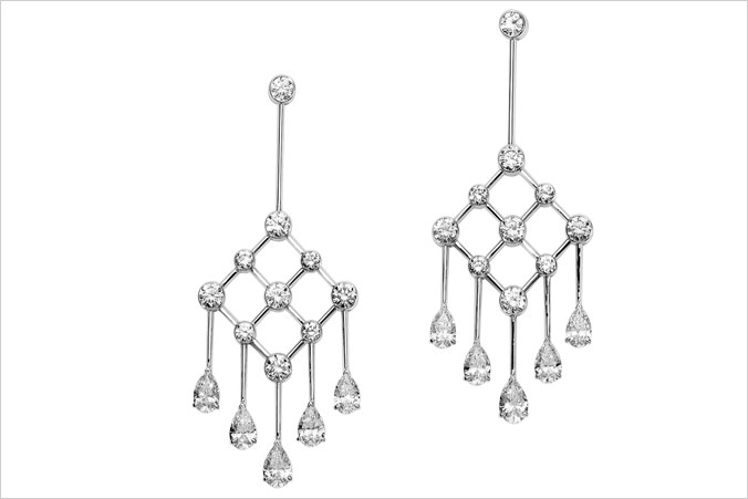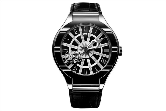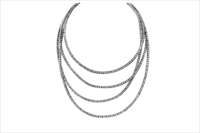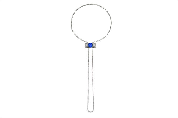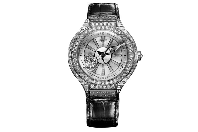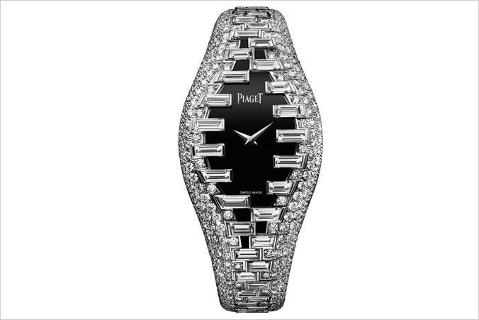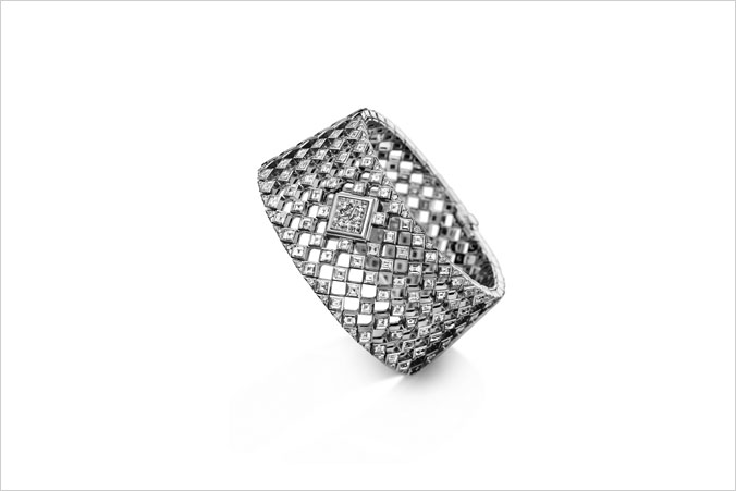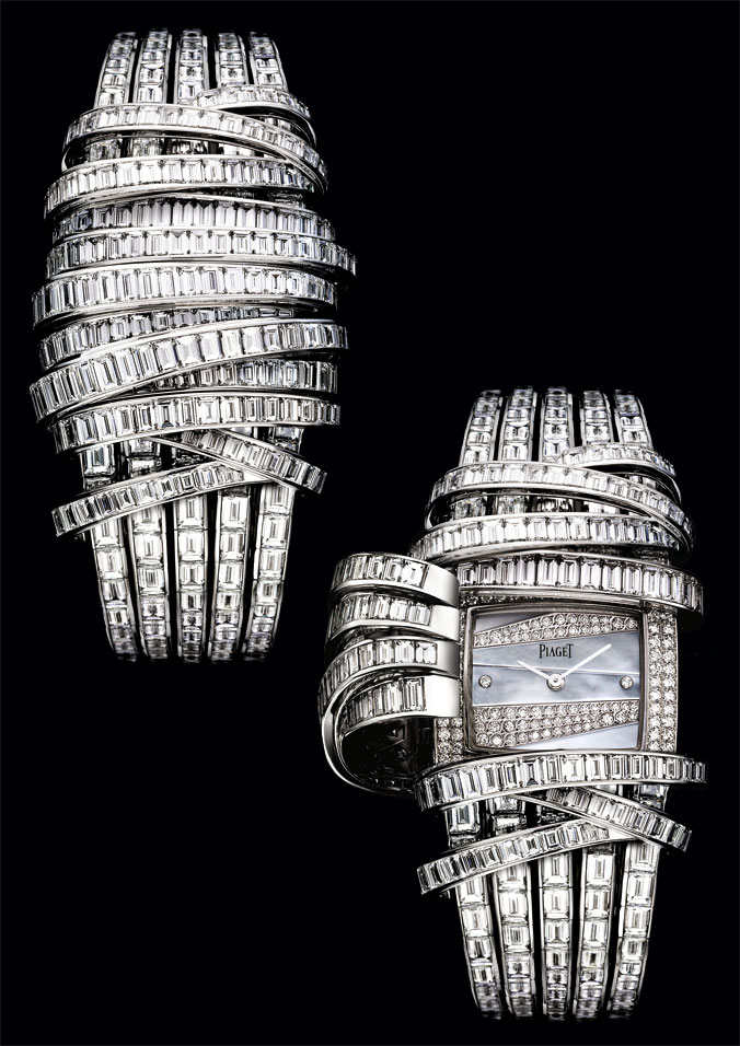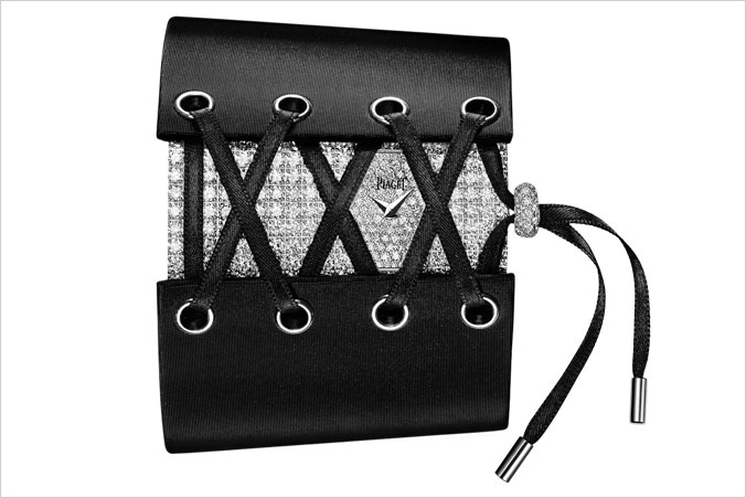在进行试装前,这一系列的珠宝预先被展示在铭镶了Piaget标示的人形模特儿上,成列的钻石在腕表或项链上排列出马甲的交错图案,或是手链上数以百计的钻石光点所编织的网状细目,以及长链上的钻石蝴蝶结。你甚至会发现,就连梨形切割钻石,都以“刺绣”的设计概念纹上了一只钻石颈圈。