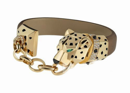 美洲豹有着色调均匀的嘴巴,斜角的轮廓,竖起的耳朵,铺镶圆钻的诱惑链条,与注入粉末的黑色帆布腕带配合得天衣无缝。