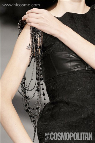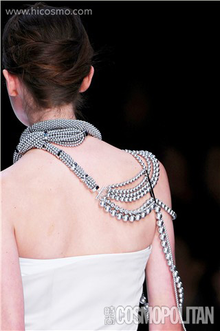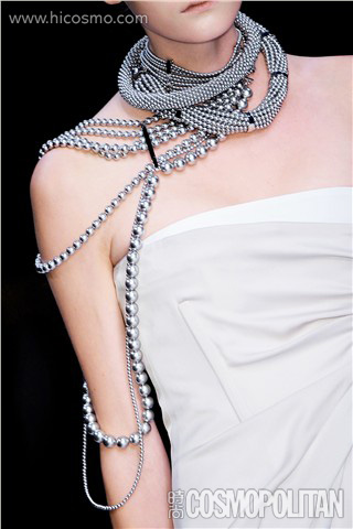 今年春夏最特别的项链搭法,就是斜肩佩戴,就像是背着单肩包一样!09春夏Celine、Chanel的秀场中都出现了这种最新潮的穿戴方法:Celine的秀场中,设计师将长短参差的多股银色珠串项链,佩戴后斜斜地搭在右肩上,在纤细肩膀的映衬下,银色的珠饰更加抢眼。